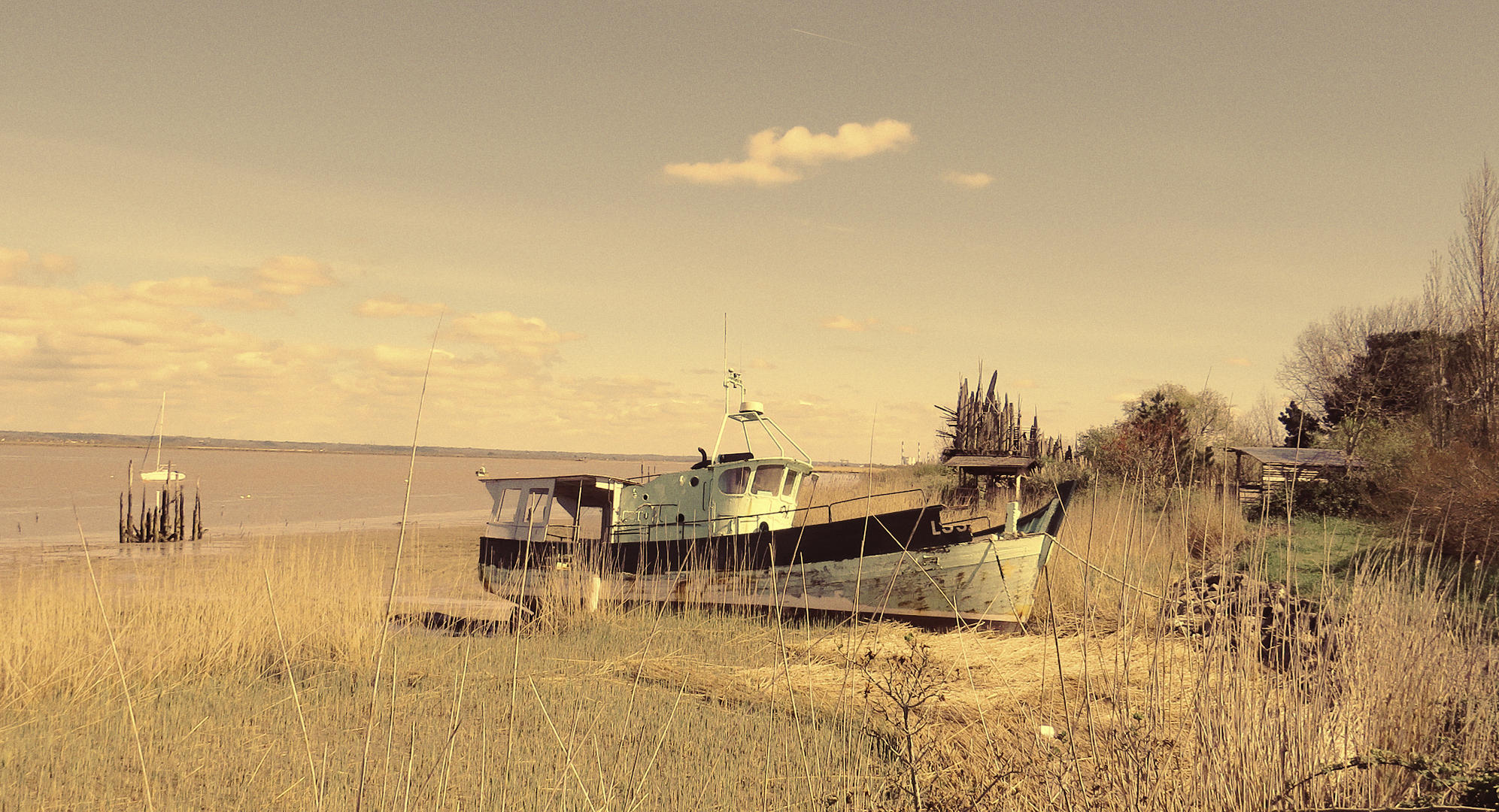 Ses voisins sont étonnants. Trace d’un ancien quai, barbelé à droite, un début de cimetière à bateaux à gauche, dont un vieux scaphandrier et sur l’arrière, le café de l’avenir avec sa pelouse synthétique en fronton et son vélo suspendu en enseigne. Loin des façades de ces riches maisons bourgeoises qui ont accueilli nombre d’armateurs aux heures de gloire de Paimbœuf, Napoléon en tête. Mais ici, plus rien n’est pareil, les jalons se brouillent, les neurones s’entrechoquent jusqu’à y distinguer un site vikingno-madmaxien-briéron.